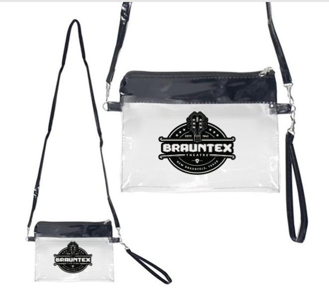Yes, the Brauntex Theatre is now selling clear bags in the Box Office. The large tote bags are $16 and the small clutch is $14. Brauntex clear bags can be purchased in the Box Office during normal business hours or the night of the show.